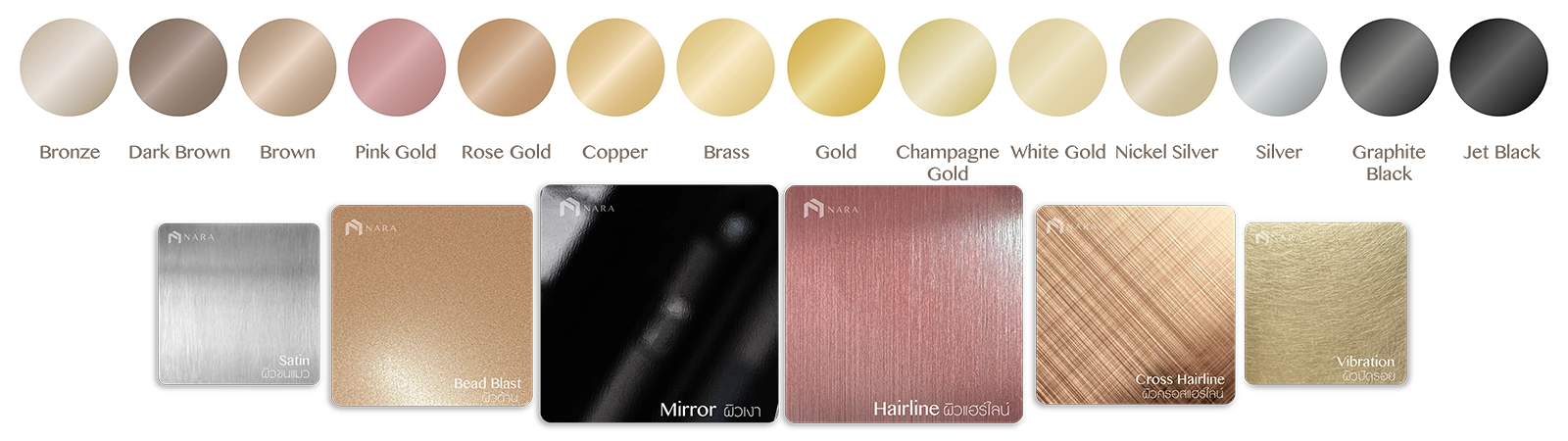 NARA Stainless เป็นผู้ผลิตและจัดจำหน่ายผลิตภัณฑ์สแตนเลสสำหรับงานตกแต่ง ที่มีสินค้าให้เลือกซื้อหลากหลาย เราจำหน่ายเส้นสแตนเลสเกรดพรีเมียม (SUS 304) ของแท้ คุณภาพสูง เงางาม ไม่เป็นสนิม สีสวยทนทานนับ 10 ปี เพื่อยกระดับการตกแต่งทั้งภายนอกและภายในอาคารของคุณให้โดดเด่นมากยิ่งขึ้น