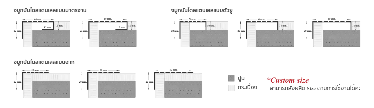 - เรารับดีไซน์จมูกบันไดกระเบื้องทุกรูปแบบ ไม่ว่าจะเป็นขนาดพิเศษหรือลายพิเศษ เพื่อเสริมเอกลักษณ์สะท้อนความเป็นตัวคุณ โดยทีมงานผู้เชี่ยวชาญด้านงานสแตนเลสมากกว่า 15 ปี